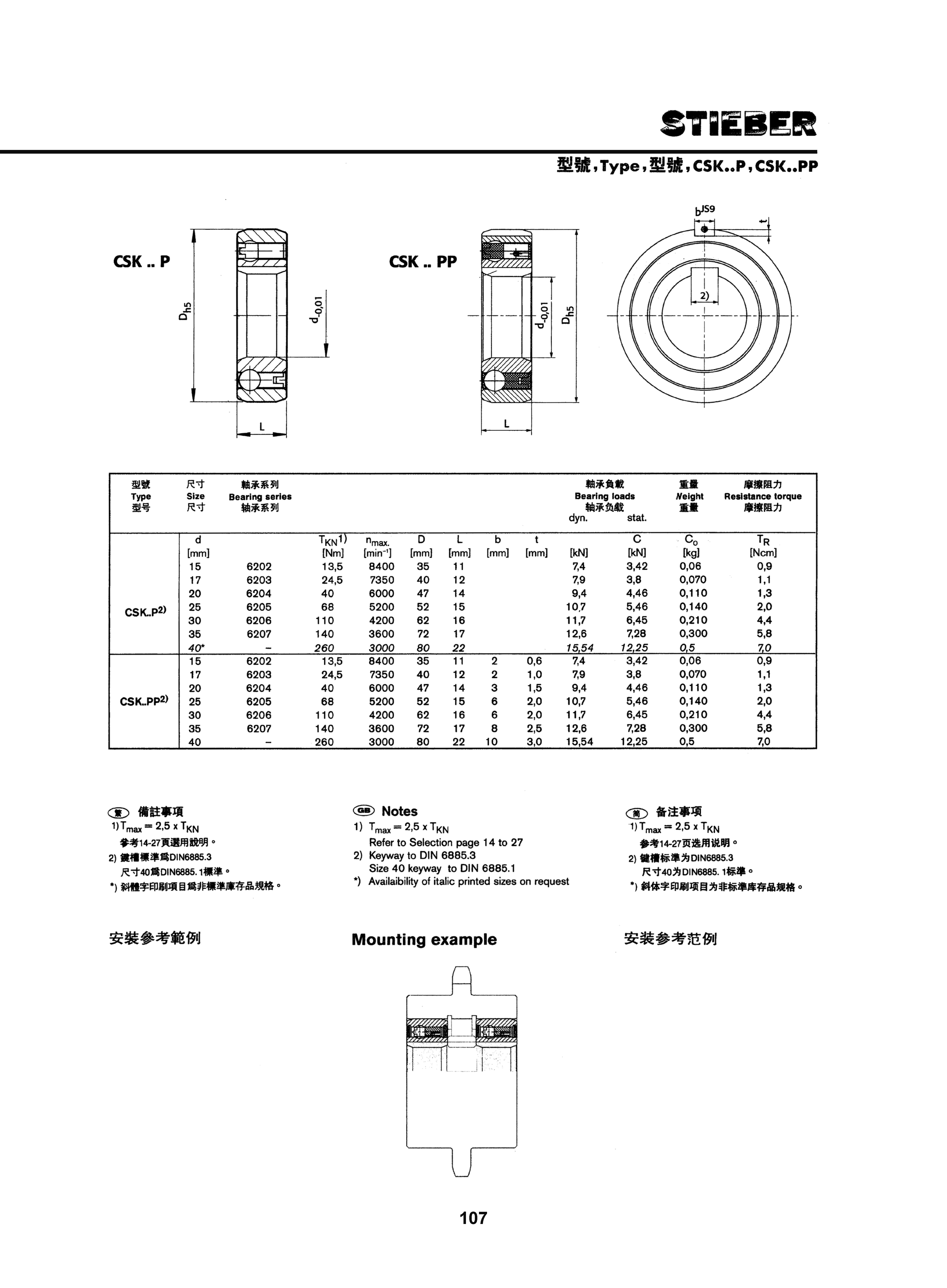 當單向離合器使用於環境溫度或工作溫度不在 +5°C 至 +60°C 範圍內時,請與我們聯繫。CSK..2RS 額外寬 5 mm,但是配有可防水濺唇形密封件。